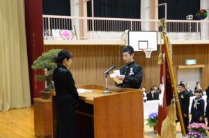 3月9日(木)第70回卒業証書授与式を挙行しました。74名の卒業生が光井中学校を巣立っていきました。卒業生を代表して、もと生徒会長が答辞を述べました。答辞では、3年間の思い出を語り、「これから私たちは、それぞれの道に進みます。長く、決して簡単な道ではないと思います。大きな壁にぶつかることもあるでしょう。しかし、どんなに辛いことがあっても私たちは、心の虹でつながっています。私たちの力を信じて、そして信じた道を進んでいくと約束します。」と、力強く決意を述べました。
