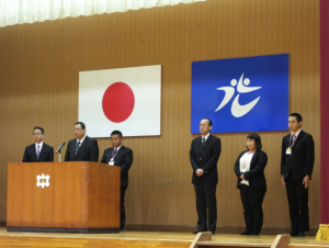 着任式では生徒会執行部の代表生徒が、新しくお迎えする先生方に歓迎の言葉を述べ、生徒全員で歓迎の気持ちを込めて、力強く校歌を歌いました。