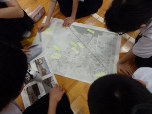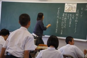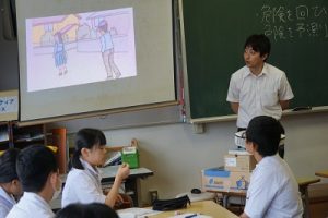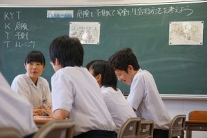 そこで、本校では6日(水)に、『危険予測トレーニング(KYT)』を行いました。この学習は、教材の絵(イラスト)や写真に潜む危険を予測し指摘し合うことで、現実に起こりそうな危険に気付き、事故に遭わないためにはどのように行動するのかを考え、自ら安全に行動できるよう危機意識や安全意識を高めることを目的としています。1年生と3年生は、山口県の学習教材を使って、2年生は光井小・中学校区の通学路安全マップを使って学習しました。