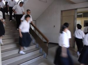 応マニュアルに沿った放送により、不審者が侵入したことを知った生徒達はまず教室に鍵を閉めて待機、不審者を取り押さえ安全確認がされた後、体育館に避難しました。緊張感を高める工夫のかいあって、生徒も緊張感をもって取り組みました。