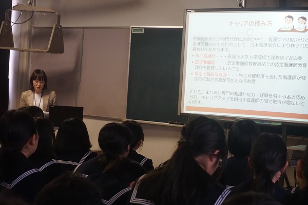キャリア教育学習を行いました。 未分類 2019.02.19 2月6日(水)に1年生のキャリア教育学習として、大和病院の看護部長の方をお招きし、お話を聞く機会がありました。 ご自身の体験や職場の看護師の方のインタビューを踏まえ、看護師の仕事についてわかりやすく教えてくださり、生徒も興味津々に聴いていました。 質疑応答の時間には、生徒のさまざまな疑問に丁寧に答えて下さいました。この時間を通して生徒はより将来について考えを深めることができたようです。