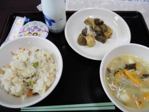 今日の給食は、枝豆じゃこご飯、白身魚のあまがらめ、切り干し大根の味噌汁、桃の花ゼリー、牛乳でした。
