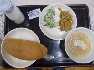今日の給食のメニューは、豚肉のカレーソテー、グリーンサラダ、ラビオリスープ、チョコクリーム、コッペパン、牛乳でした。