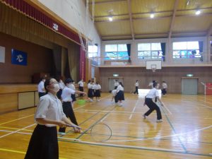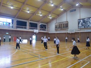 今日から、学級委員長会が企画した「健康時間」の活動が始まりました。各学年の学級委員長の生徒達が、それぞれの学年が取り組む活動を決め、学年毎に分かれて活動しました。今日はそのうち、2年生が活動した体育館にお邪魔しました。2年生は、給食当番以外の人が参加してバドミントンを楽しみました。体育館がやや手狭なため、けっこう窮屈な感じでしたが、お互いの距離に気を配りながらラケットを振っていました。