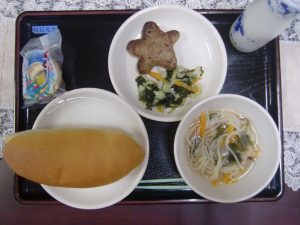 今日の給食のメニューは、七夕にちなんで七夕ハンバーグ、そうめん汁、海藻サラダ、お星様タルト、コッペパン、牛乳でした。
