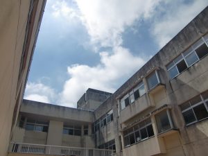 今日は朝から空が明るく、10時頃からは、はっきりと晴れ間が見えるようになってきました。ついこの間のことであるはずなのに、ずいぶん久しぶりに感じました。それだけ、この雨が長く、激しかったということだと思います。でもこうやって晴れ間を目にすると使い古された言い回しではありますが「止まない雨はない」という言葉を思い出さずにはいられません。この晴れ間のように、今のコロナ禍も、いつかすっきり晴れてくれることを信じて頑張らなければと思います。(下の写真は、校舎中庭からのものです)