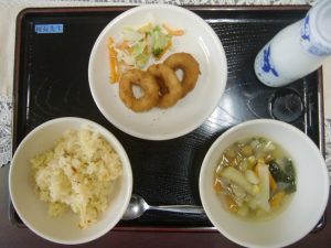 ところで今日の給食は、「ギリシャ料理」でした。メニューは、ピラフィ(ピラフ)、カラマリ(いかリング)、レモン風味のサラダ、レヴィスィア(ひよこ豆のスープ)、牛乳でした。味のほうは、お子様に聴いてみていただければと思います。