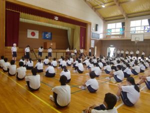 全校集会がありました。まず秋季大会の表彰を行った後、専門委員会からの目標等の発表、生徒会長のあいさつと続き、最後に体育祭実行委員長から本年度の体育祭のスローガン「Do our best ~仲間との最高の一瞬を大切に~」が発表されました。今週末をもって、本校もようやく短い夏休みに入り、体育祭の活動は夏休み後ということになりますが、このスローガンのもとに、体育祭はもとよりすべてにおいてベストを尽くせるよう頑張りましょう。