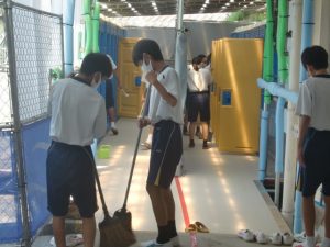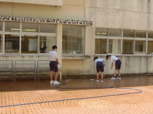 短い夏休みが終了しました。今年は県内でも市町によって夏休みの期間が異なり、山口市などは17日からすでに授業が始まっていたようですが、本市では小中学校とも今日から学校再開です。連日猛暑に見舞われていますが、そんな中でも子ども達は元気に学校生活に臨んでいます。写真は、久々の掃除時間の様子です。