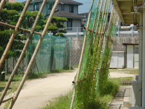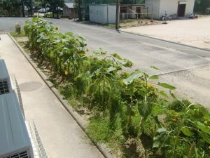 こんな暑さの中でも、植物は元気に育っています。地域の方々に設置していただいた緑のカーテンも、例年に比べるとちょっと生育が遅いということですが、順調に育っています。また、子ども達が植えたひまわりなども、元気にすくすくと育っています。私たちも、植物に負けないよう日々健康に過ごしていきたいと思います。