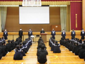 新生徒会役員による今年最初の生徒集会が行われました。各専門委員長から、年間活動方針と月間目標の報告があり、その後に生徒会長から本年度の生徒会の活動方針とスローガンの発表がありました。 今年のスローガンは「夢現」です。夢を現実のものとするために、学校が一丸となって生徒会活動を盛り上げていきましょう。