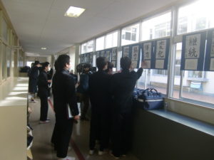 そんな中で行われた「書き初め展」です。廊下に掲示し、各学年1フロア10分間限定で全学年の作品を鑑賞しました。やや「密」が気になるところでしたが、生徒達はお互いの作品を鑑賞し合い、楽しんでいました。
