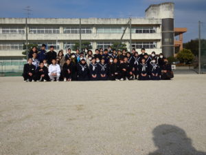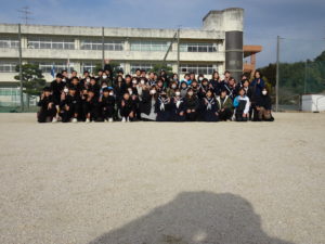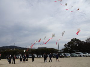 第2部は、グラウンドでそれぞれの思いを込めた凧を連凧にして揚げました。あいにく今日は無風だったので、人力で揚げることになりましたが、それでも空高く凧が舞う場面もあり、とてもよかったです。最後は、保護者の方々も一緒に記念撮影をしました。今日の誓いを胸に、これからしっかり頑張ってほしいと思います。