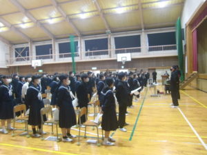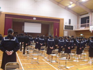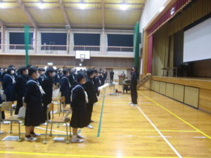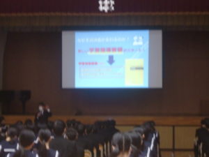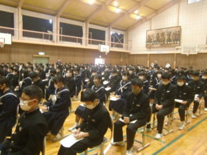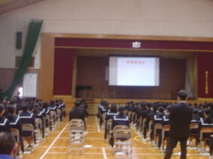 年度初めの全校集会・生徒集会を行いました。まず全校集会では、学習指導や生徒指導、部活動や清掃活動、保健や情報教育に関することなど、学校生活に必要なさまざまな説明を担当教員が行いました。その後の生徒集会では、生徒会が主催となり、「市民憲章と校訓の唱和」にはじまり、生徒会組織の説明や委員会活動の紹介など、工夫を凝らして行っていました。1年生も、今日1日でずいぶん学校の様子がわかってきたのではないかと思います。