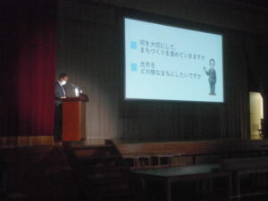 10日に、1.2年生を対象に「市長と気軽にミーティング」を行いました。光市の市川市長に実際にお越しいただき、講演と意見交換会を行いました。市長さんとお話しする機会は滅多にないので生徒たちは緊張していましたが、徐々に雰囲気が和んできて、最後は笑顔で記念撮影をすることができました。この模様は、11月11日(金)にKビジョンの「タウンニュース」で放送されるそうです。