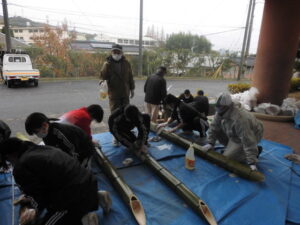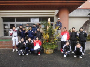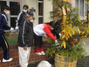 新生徒会役員の「仕事始め」となる門松づくりが、今年も地域の方々のご指導の下で行われました。当日はあいにくの雨で、気温も低かったのですが、地域の皆様の熱心なご指導のおかげで立派な門松が完成しました。学校にお立ち寄りの際はぜひご覧ください。