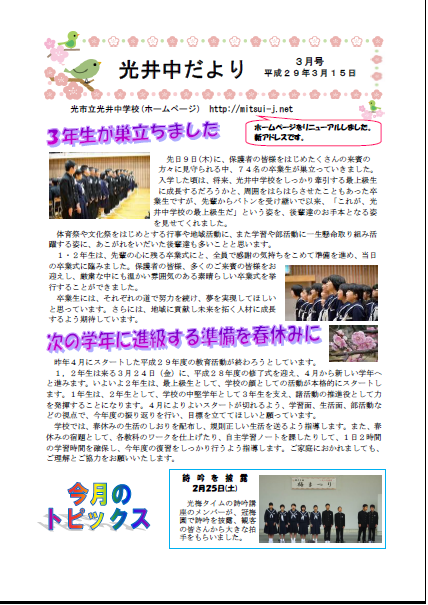 学校だより 学校だより4月号 学校だよりが、『コミュニティ みつい』に仲間入りしました。『コミュニティ みつい』を掲載します。下記の「4月号」または「画像」をクリックして、ご覧ください。4月号 2017.05.16 学校だより